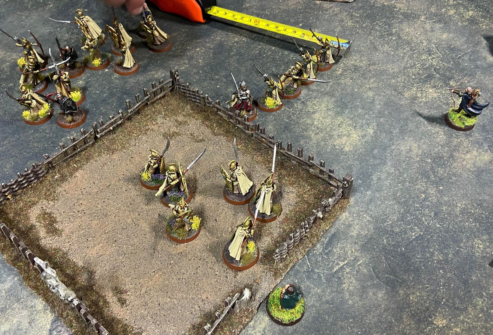 Legolas had continued to snipe the rangers, killing one but ended up being charged, turn after turn until some knights charged him. He managed to win several fights and killed 3/4 before finally losing and taking 2 wounds. He, obviously, then failed all three fate and succumbed. Glorfindel continued to hold off and killed the second ranger along with more knights.
