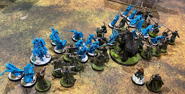 The lines hit as Tauriel called a Heroic Move, with Aragorn and KotD behind two warriors and my elves caused a blockage to keep them out of the combats for the turn. In the shoot phase, the Mirkwood rangers opened fire at Legolas and caused a wound, saved by his third fate. In combat, Grimbeorn hurled a warrior of the Dead through their lines, killing him and knocking their banner prone to avoid rerolls.